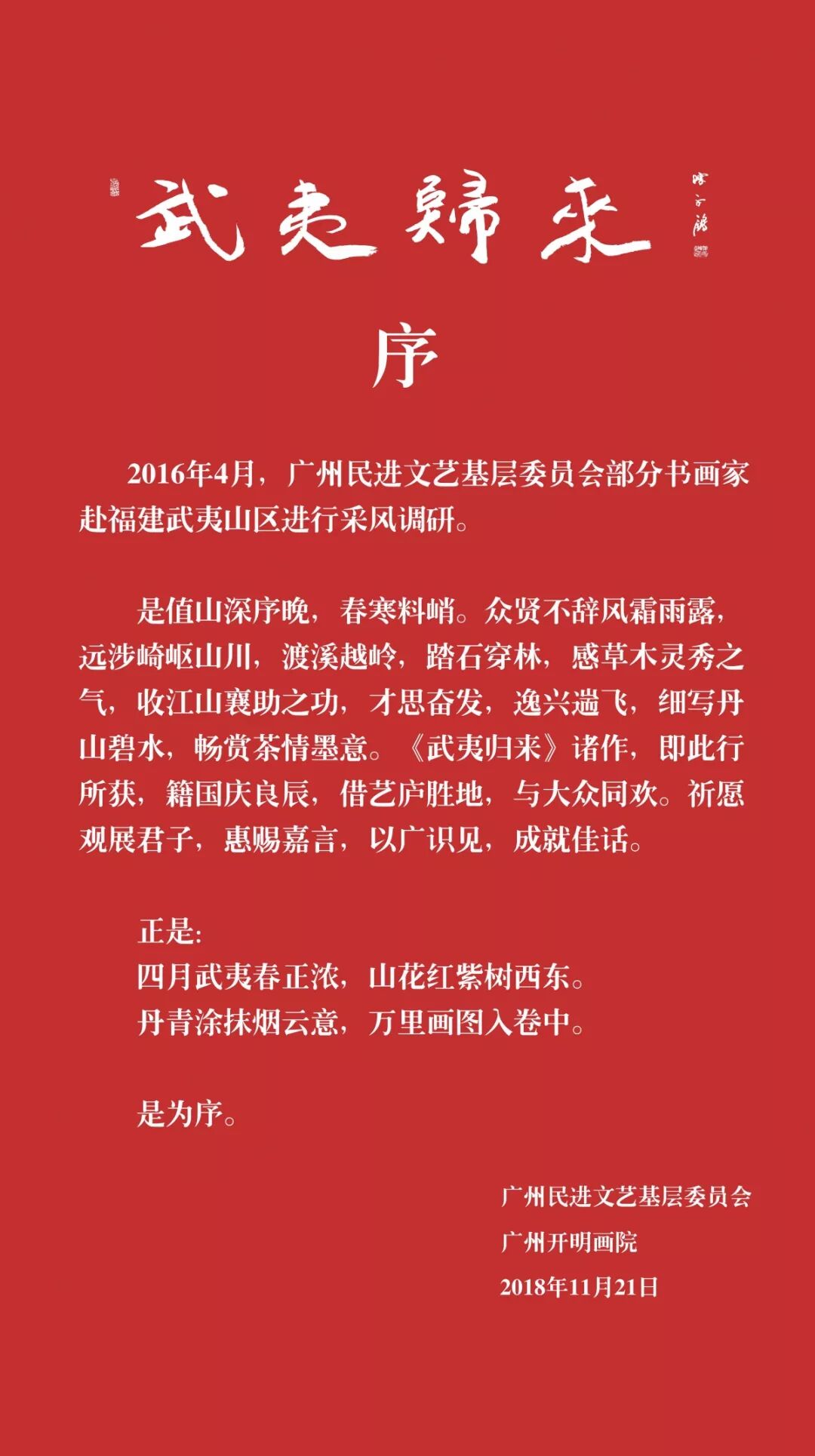 2018年11月21日上午10时,“正山堂杯”全国第三届茶文化书法巡回展·民进广州市委文艺基层委员会《武夷归来》书画展在广州市国茶荟博物馆开幕。