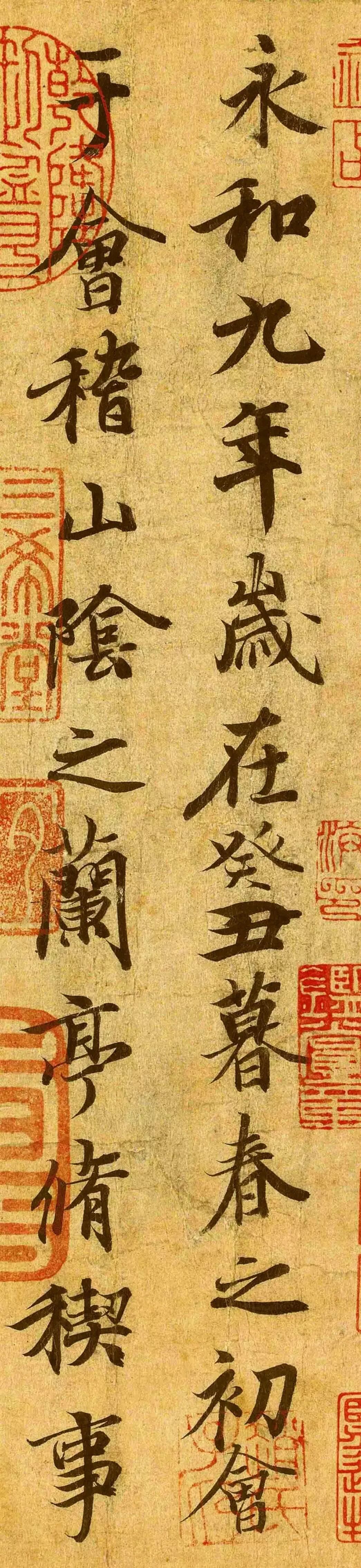 永和九年,岁在癸丑,暮春之初,会于会稽山阴之兰亭,修禊事也。群贤毕至,少长咸集。此地有崇山峻岭,茂林修竹,又有清流激湍,映带左右。引以为流觞曲水,列坐其次。虽无丝竹管弦之盛,一觞一咏,亦足以畅叙幽情。