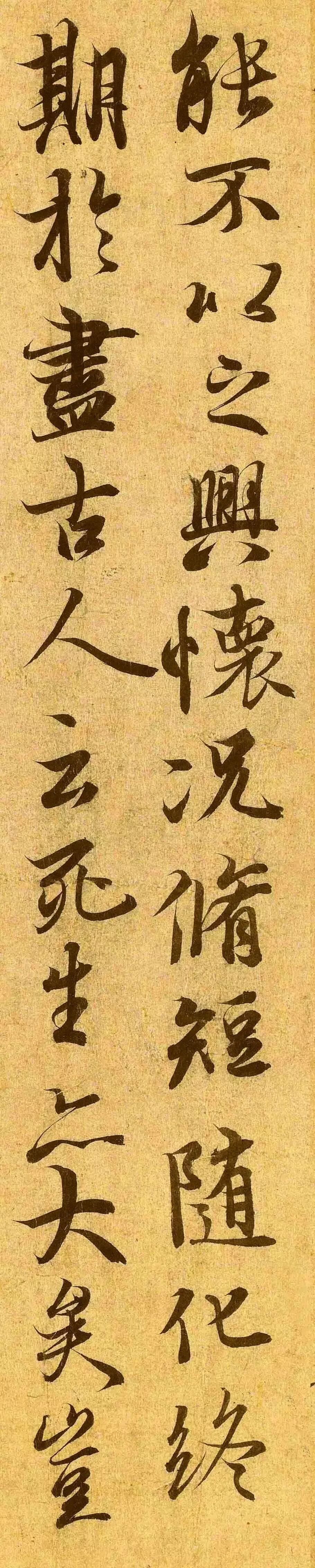 夫人之相与,俯仰一世。或取诸怀抱,悟言一室之内;或因寄所托,放浪形骸之外。虽趣舍万殊,静躁不同,当其欣于所遇,暂得于己,快然自足,不知老之将至。及其所之既倦,情随事迁,感慨系之矣。向之所欣,俯仰之间,已为陈迹,犹不能不以之兴怀。况修短随化,终期于尽。古人云:“死生亦大矣!”岂不痛哉!