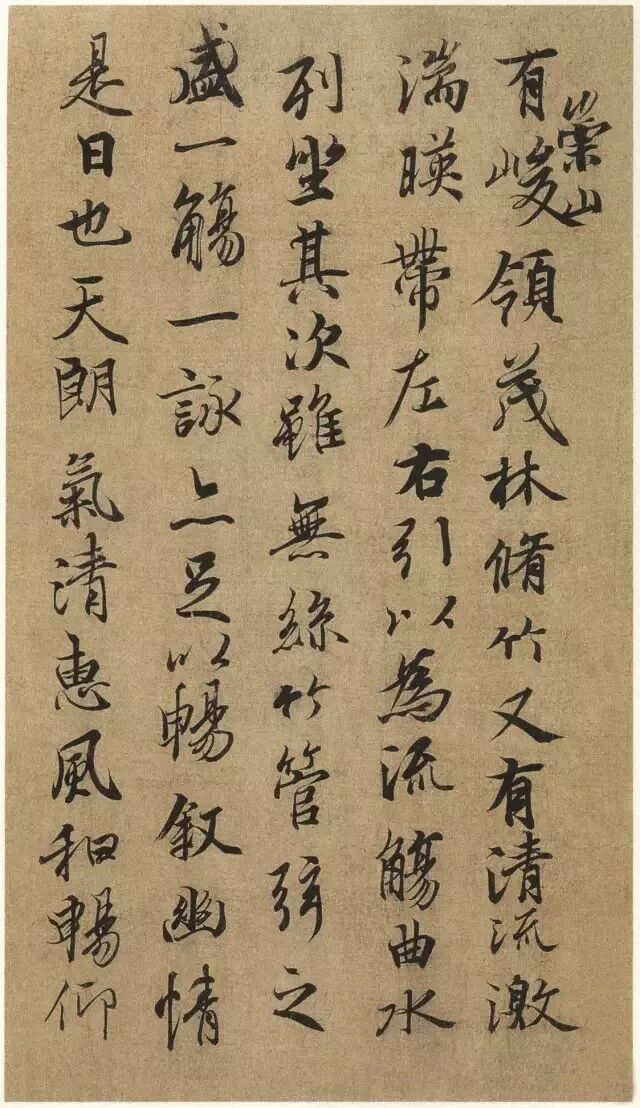 大家分坐于曲水之旁,借着宛转的溪水,以觞盛酒,置于水上。他们一边喝酒一边作诗,也发表一些议论。大家即兴写下了许多诗篇,下面这首便是王羲之当时的作品。